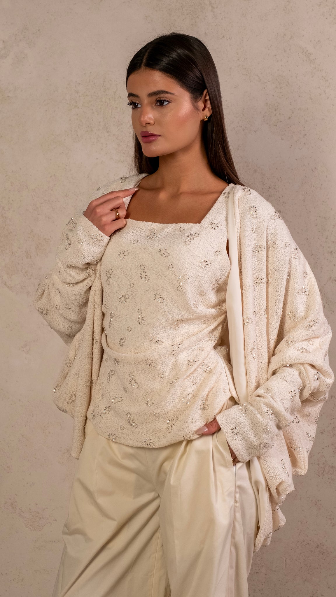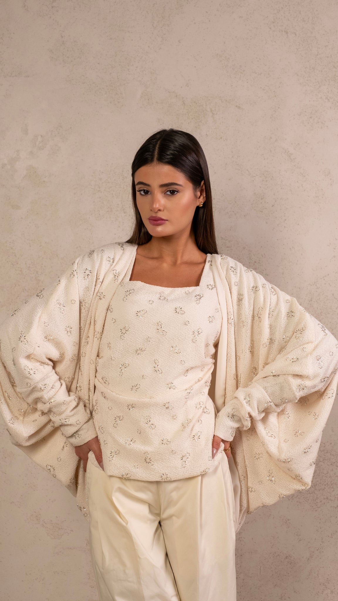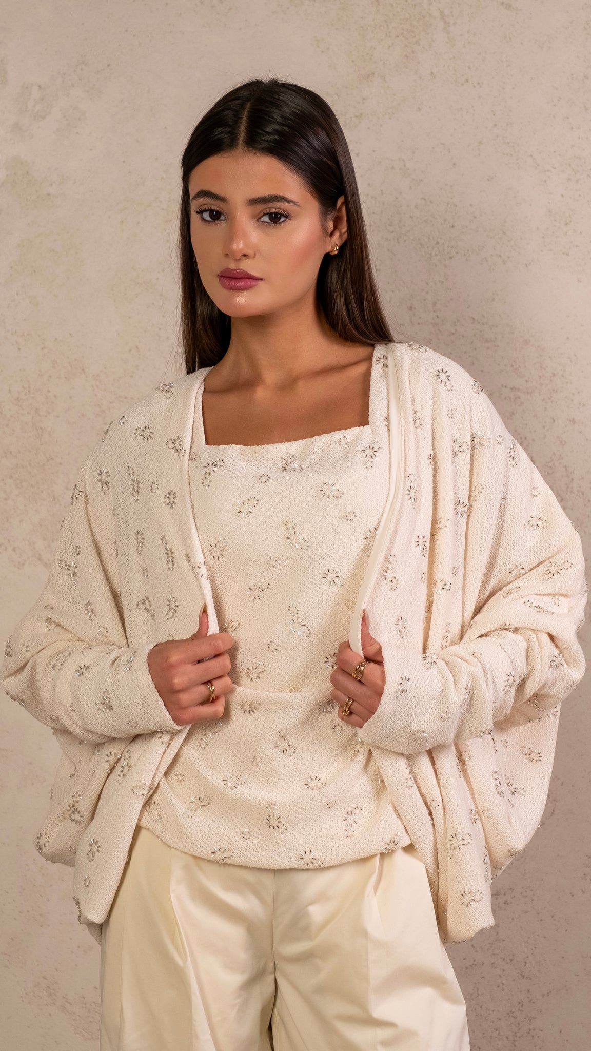 3 pieces set featuring hand embroidery tank top, flowy cardigan and biege pants.