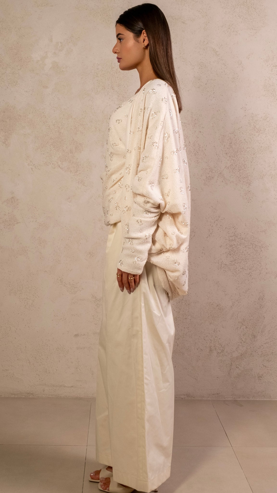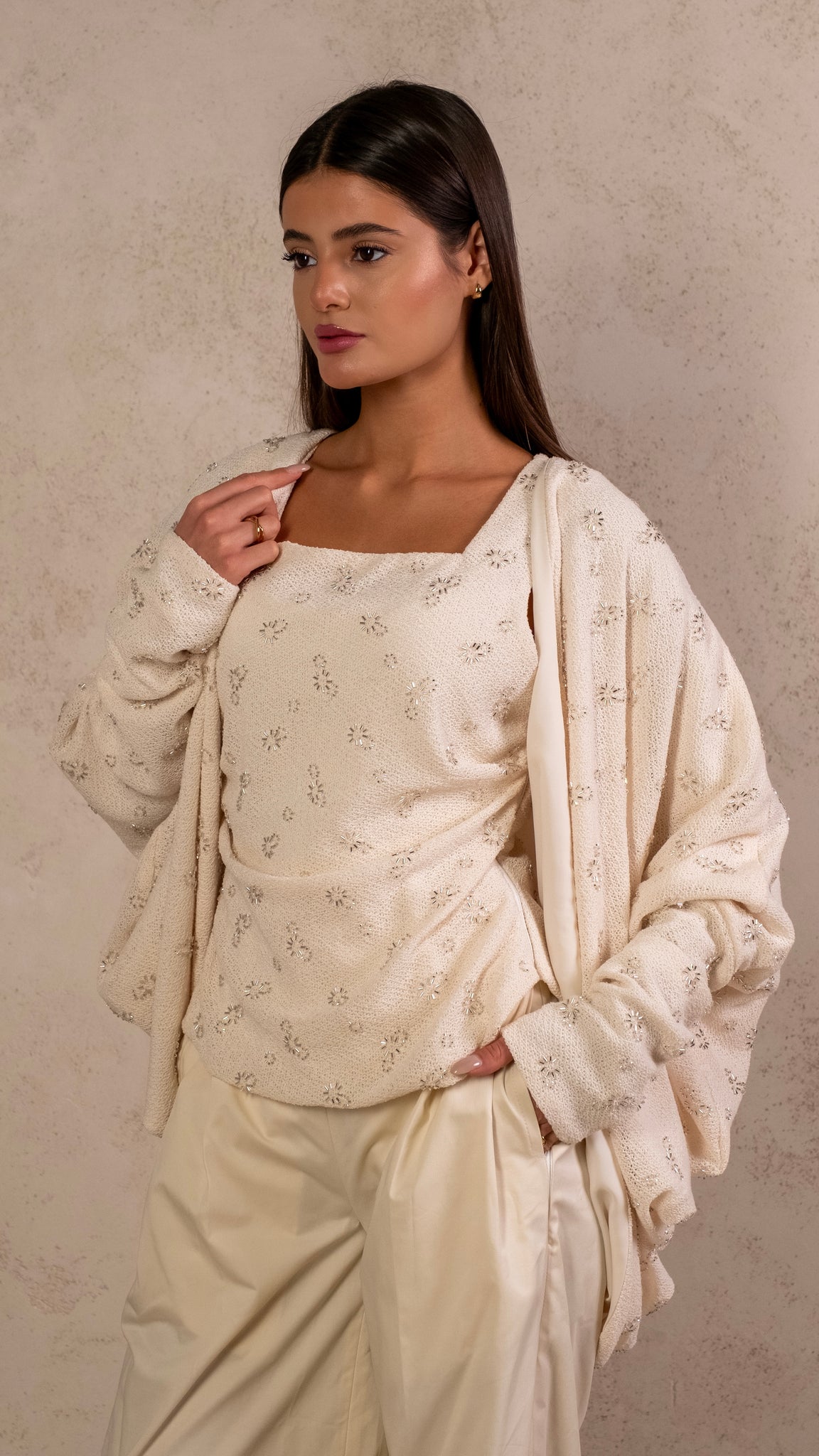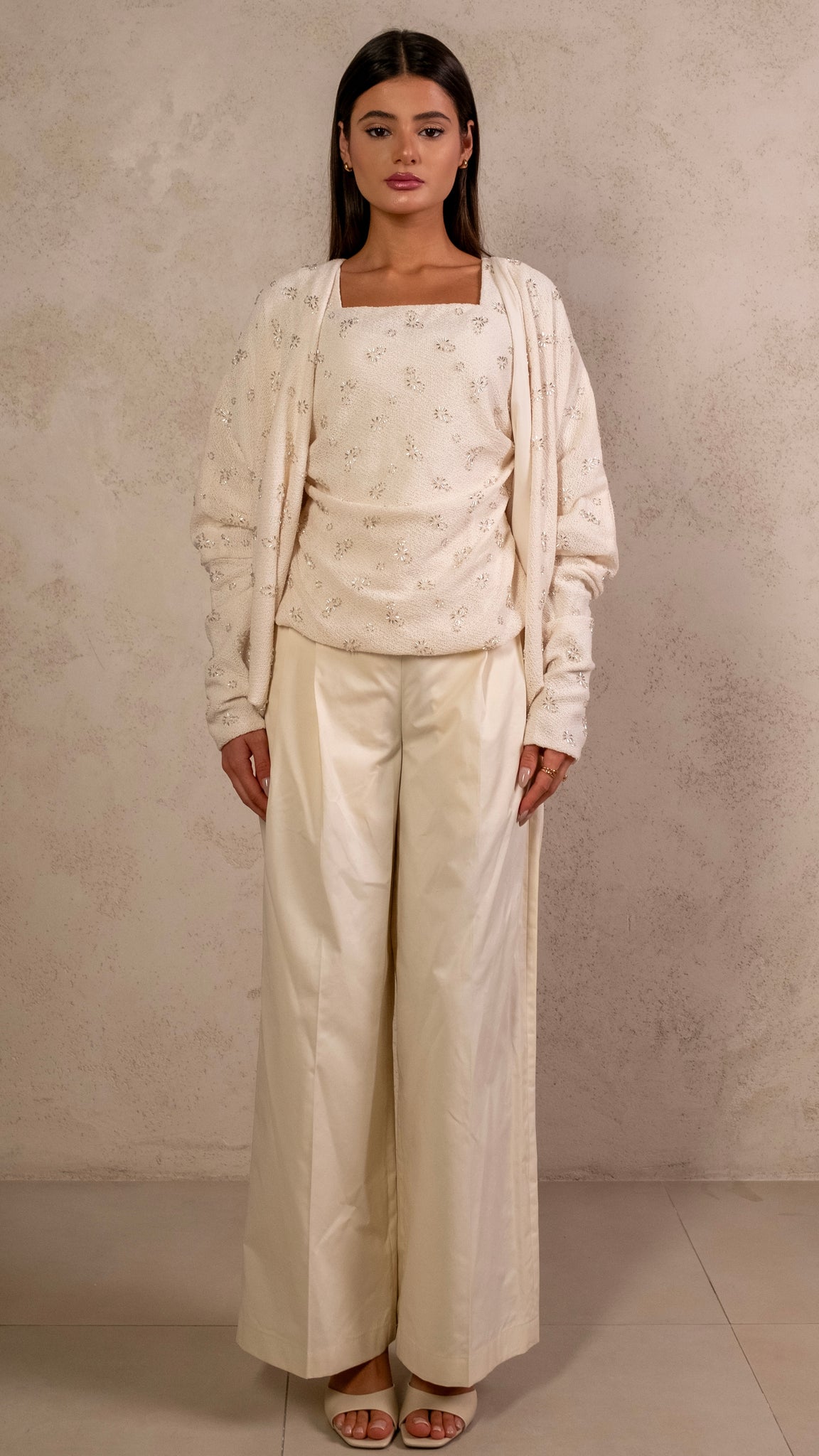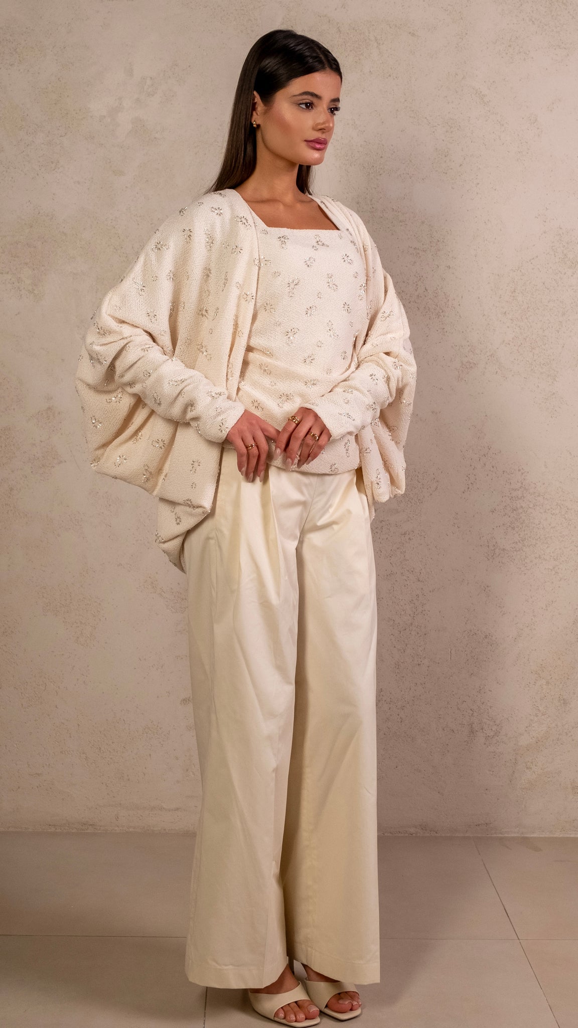 3 pieces set featuring hand embroidery tank top, flowy cardigan and biege pants.
